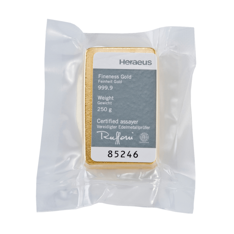 Each 250g Heraeus gold bar contains 250 grams of 999.9 fine gold and features official refinery markings confirming its weight, purity, and origin. These markings verify authenticity and help ensure efficient resale through international bullion dealers.