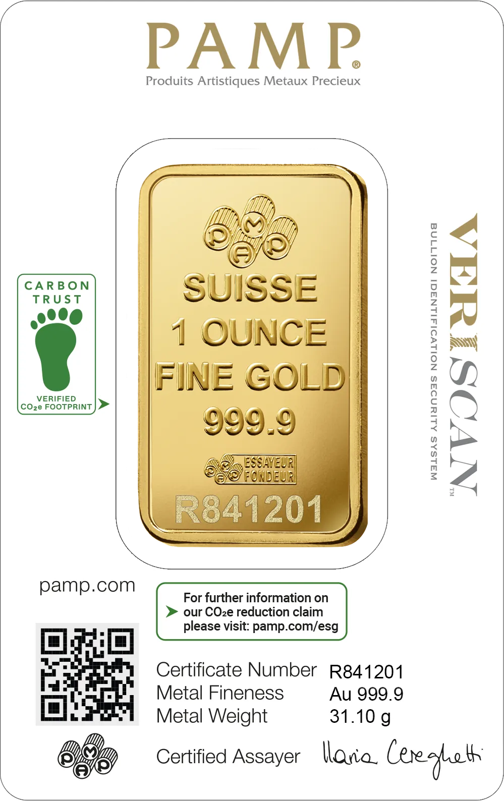 The Lady Fortuna™ is the most recognized and prestigious bullion bar design in the world. Accredited by the Swiss Federal Bureau, each bar is individually registered and sealed within protective CertiPAMP™ packaging with an integrated and official Assay Certifcate that guarantees fine precious metal content and weight, protected with a removable film. The classic and widely popular 1oz denomination of the Lady Fortuna™ pure gold bar is also the first minted bar to achieve a Carbon Trust reduced carbon footprint verification. The Carbon Trust is a global climate consultancy driven by the mission to accelerate the move to a decarbonized future. Relates to SKUs ZAUFS00606 and ZAUFS00610. This Carbon Reduced bar is the evolution of the Carbon Neutral Lady Fortuna 1oz gold minted bar for which production ended on March 31, 2025.