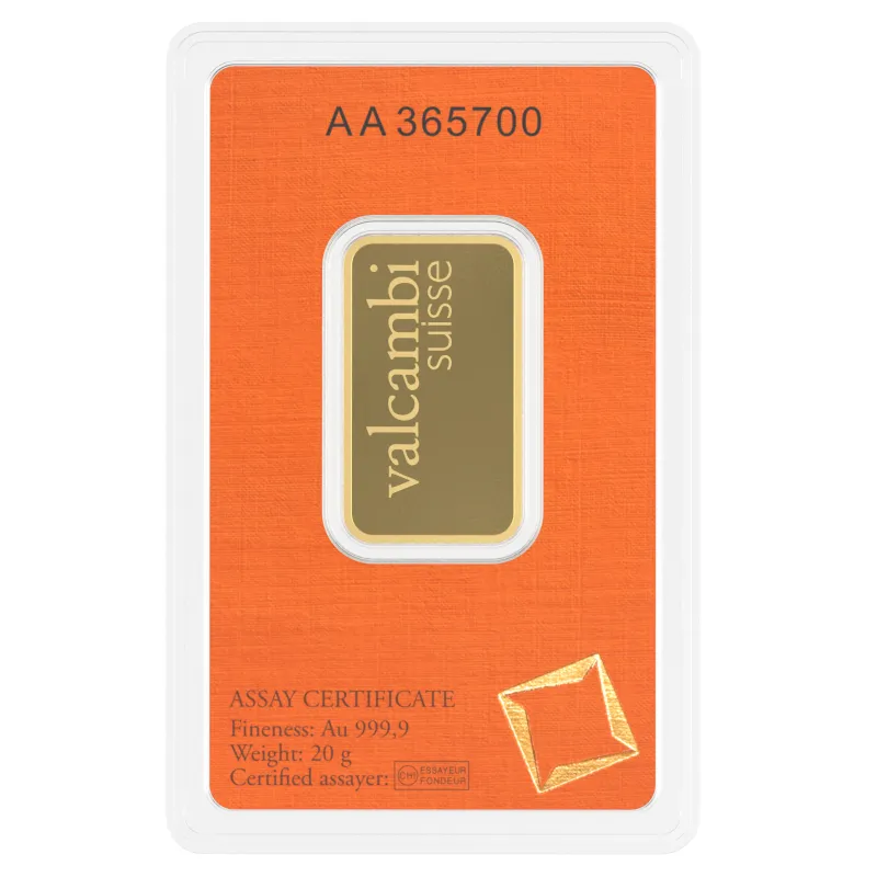 Premium 999.9 fine gold (24K) 20 g gold bar by Valcambi. Investment-grade bullion in sealed assay packaging, globally tradable, high liquidity, and ideal for structured gold investment and long-term wealth preservation.